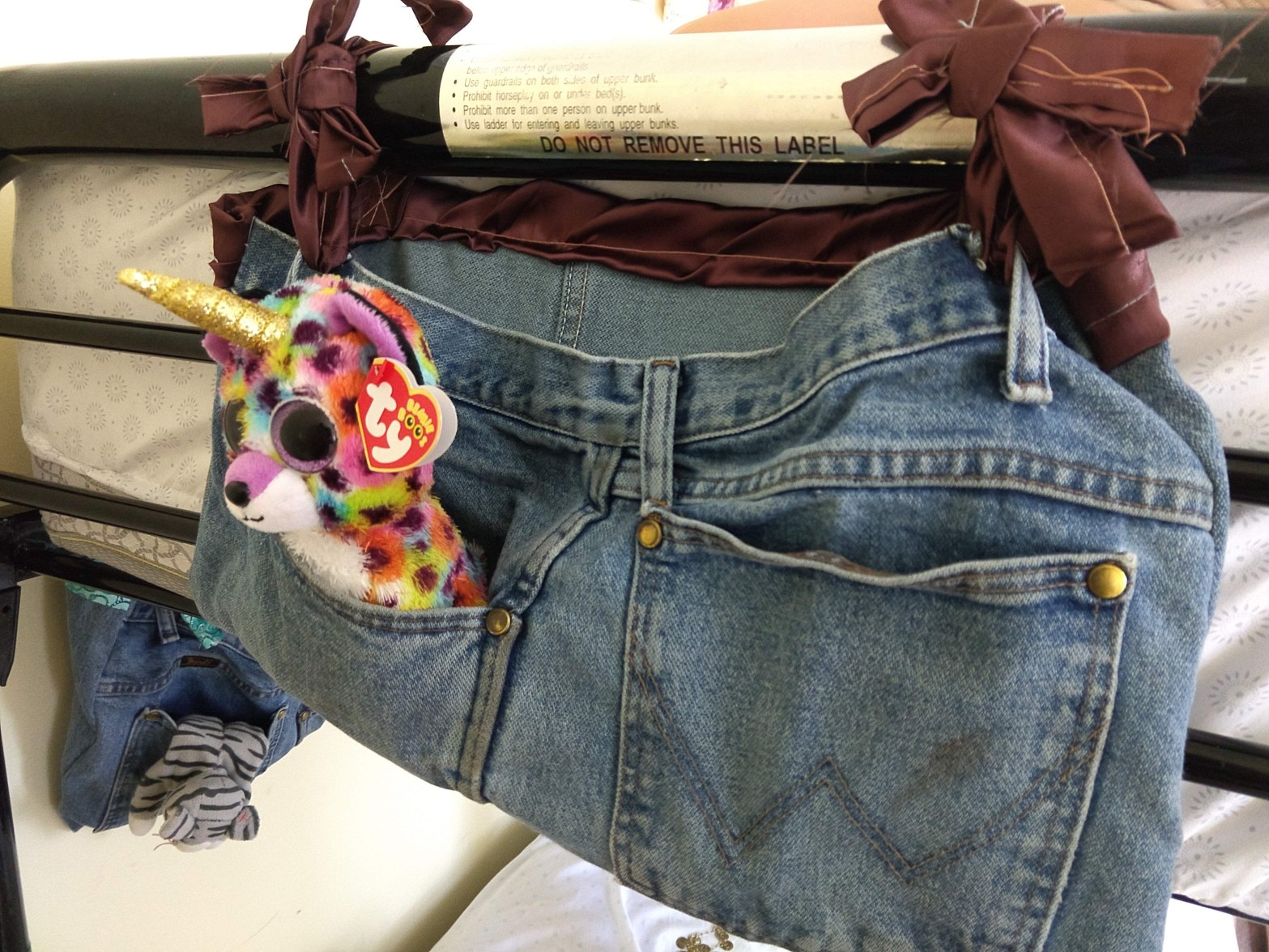 I took a pair of ripped jeans and cut them in half making sure to include pockets as best I could. I let the kids pick some fabric for edging. I sewed the back seem and added two straps. Next, sew up the sides creating a another large pocket. After looping the straps around the bunk I fished them through the belt loops and made a bow.